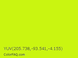 YUV 205.738,-93.541,-4.155 Color is a normal lime color and the nearest color is Arctic Lime #d0ff14. Hex code #c9f510 and RGB value is rgb(201,245,16). In RGB color space, this color is composed of 79% red, 96% green, 6% blue, In CMYK color space, this color is composed of 18% cyan, 0% magenta, 93% yellow , 4% black , In HSL color space, this color has a hue angle of 72° , 92% saturation and 51% lightness.