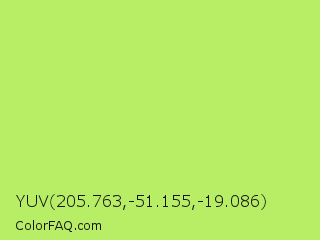 YUV 205.763,-51.155,-19.086 Color is a light green color and the nearest color is Inchworm #b2ec5d. Hex code #b8ed66 and RGB value is rgb(184,237,102). In RGB color space, this color is composed of 72% red, 93% green, 40% blue, In CMYK color space, this color is composed of 22% cyan, 0% magenta, 57% yellow , 7% black , In HSL color space, this color has a hue angle of 84° , 79% saturation and 66% lightness.