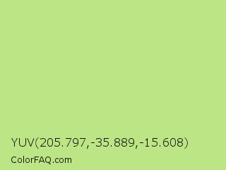 YUV 205.797,-35.889,-15.608 Color is a light green color and the nearest color is Yellow Green #c5e17a. Hex code #bce585 and RGB value is rgb(188,229,133). In RGB color space, this color is composed of 74% red, 90% green, 52% blue, In CMYK color space, this color is composed of 18% cyan, 0% magenta, 42% yellow , 10% black , In HSL color space, this color has a hue angle of 86° , 65% saturation and 71% lightness.