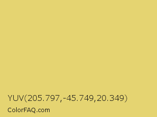 YUV 205.797,-45.749,20.349 Color is a light yellow color and the nearest color is Straw #e4d96f. Hex code #e5d471 and RGB value is rgb(229,212,113). In RGB color space, this color is composed of 90% red, 83% green, 44% blue, In CMYK color space, this color is composed of 0% cyan, 7% magenta, 51% yellow , 10% black , In HSL color space, this color has a hue angle of 51° , 69% saturation and 67% lightness.
