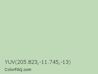YUV 205.823,-11.745,-13 Color is a light green color and the nearest color is Pixie Green #c0d8b6. Hex code #bfdab6 and RGB value is rgb(191,218,182). In RGB color space, this color is composed of 75% red, 85% green, 71% blue, In CMYK color space, this color is composed of 12% cyan, 0% magenta, 17% yellow , 15% black , In HSL color space, this color has a hue angle of 105° , 33% saturation and 78% lightness.