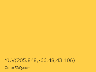 YUV 205.848,-66.48,43.106 Color is a light orange color and the nearest color is Bright Sun #fed33c. Hex code #ffcf47 and RGB value is rgb(255,207,71). In RGB color space, this color is composed of 100% red, 81% green, 28% blue, In CMYK color space, this color is composed of 0% cyan, 19% magenta, 72% yellow , 0% black , In HSL color space, this color has a hue angle of 44° , 100% saturation and 64% lightness.
