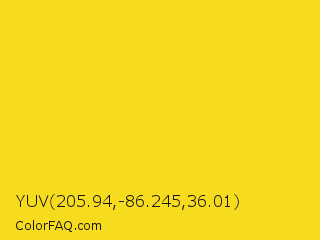 YUV 205.94,-86.245,36.01 Color is a normal yellow color and the nearest color is Ripe Lemon #f4d81c. Hex code #f7db1f and RGB value is rgb(247,219,31). In RGB color space, this color is composed of 97% red, 86% green, 12% blue, In CMYK color space, this color is composed of 0% cyan, 11% magenta, 87% yellow , 3% black , In HSL color space, this color has a hue angle of 52° , 93% saturation and 55% lightness.