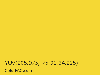 YUV 205.975,-75.91,34.225 Color is a normal yellow color and the nearest color is Golden Dream #f0d52d. Hex code #f5d834 and RGB value is rgb(245,216,52). In RGB color space, this color is composed of 96% red, 85% green, 20% blue, In CMYK color space, this color is composed of 0% cyan, 12% magenta, 79% yellow , 4% black , In HSL color space, this color has a hue angle of 51° , 91% saturation and 58% lightness.