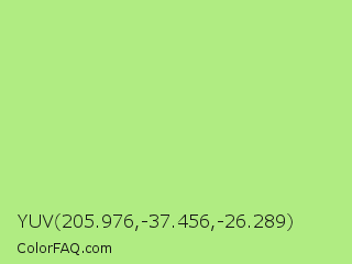 YUV 205.976,-37.456,-26.289 Color is a light green color and the nearest color is Sulu #c1f07c. Hex code #b0ec82 and RGB value is rgb(176,236,130). In RGB color space, this color is composed of 69% red, 93% green, 51% blue, In CMYK color space, this color is composed of 25% cyan, 0% magenta, 45% yellow , 7% black , In HSL color space, this color has a hue angle of 94° , 74% saturation and 72% lightness.