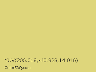 YUV 206.018,-40.928,14.016 Color is a light yellow color and the nearest color is Straw #e4d96f. Hex code #ded67b and RGB value is rgb(222,214,123). In RGB color space, this color is composed of 87% red, 84% green, 48% blue, In CMYK color space, this color is composed of 0% cyan, 4% magenta, 45% yellow , 13% black , In HSL color space, this color has a hue angle of 55° , 60% saturation and 68% lightness.