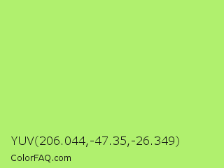 YUV 206.044,-47.35,-26.349 Color is a light green color and the nearest color is Inchworm #b2ec5d. Hex code #b0f06e and RGB value is rgb(176,240,110). In RGB color space, this color is composed of 69% red, 94% green, 43% blue, In CMYK color space, this color is composed of 27% cyan, 0% magenta, 54% yellow , 6% black , In HSL color space, this color has a hue angle of 90° , 81% saturation and 69% lightness.