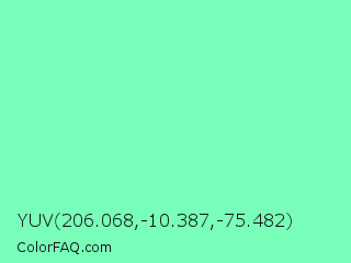 YUV 206.068,-10.387,-75.482 Color is a light green color and the nearest color is Aquamarine #7fffd4. Hex code #78feb9 and RGB value is rgb(120,254,185). In RGB color space, this color is composed of 47% red, 100% green, 73% blue, In CMYK color space, this color is composed of 53% cyan, 0% magenta, 27% yellow , 0% black , In HSL color space, this color has a hue angle of 149° , 99% saturation and 73% lightness.
