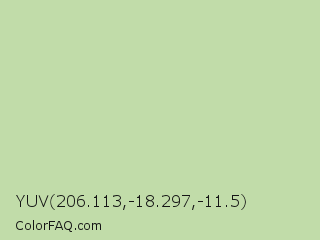 YUV 206.113,-18.297,-11.5 Color is a light green color and the nearest color is Sprout #c1d7b0. Hex code #c1dca9 and RGB value is rgb(193,220,169). In RGB color space, this color is composed of 76% red, 86% green, 66% blue, In CMYK color space, this color is composed of 12% cyan, 0% magenta, 23% yellow , 14% black , In HSL color space, this color has a hue angle of 92° , 42% saturation and 76% lightness.
