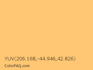 YUV 206.168,-44.946,42.826 Color is a light orange color and the nearest color is Topaz #ffc87c. Hex code #ffc773 and RGB value is rgb(255,199,115). In RGB color space, this color is composed of 100% red, 78% green, 45% blue, In CMYK color space, this color is composed of 0% cyan, 22% magenta, 55% yellow , 0% black , In HSL color space, this color has a hue angle of 36° , 100% saturation and 73% lightness.