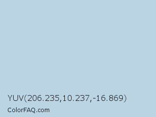 YUV 206.235,10.237,-16.869 Color is a very light blue color and the nearest color is Pale Aqua #bcd4e6. Hex code #bbd4e3 and RGB value is rgb(187,212,227). In RGB color space, this color is composed of 73% red, 83% green, 89% blue, In CMYK color space, this color is composed of 18% cyan, 7% magenta, 0% yellow , 11% black , In HSL color space, this color has a hue angle of 203° , 42% saturation and 81% lightness.