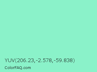 YUV 206.23,-2.578,-59.838 Color is a light green color and the nearest color is Riptide #8be6d8. Hex code #8af2c9 and RGB value is rgb(138,242,201). In RGB color space, this color is composed of 54% red, 95% green, 79% blue, In CMYK color space, this color is composed of 43% cyan, 0% magenta, 17% yellow , 5% black , In HSL color space, this color has a hue angle of 156° , 80% saturation and 75% lightness.