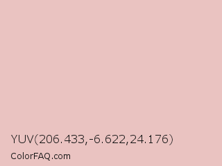 YUV 206.433,-6.622,24.176 Color is a very light red color and the nearest color is Beauty Bush #eec1be. Hex code #eac3c1 and RGB value is rgb(234,195,193). In RGB color space, this color is composed of 92% red, 76% green, 76% blue, In CMYK color space, this color is composed of 0% cyan, 17% magenta, 18% yellow , 8% black , In HSL color space, this color has a hue angle of 3° , 49% saturation and 84% lightness.