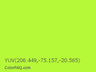 YUV 206.449,-75.157,-20.565 Color is a normal green color and the nearest color is Green Yellow #adff2f. Hex code #b7f836 and RGB value is rgb(183,248,54). In RGB color space, this color is composed of 72% red, 97% green, 21% blue, In CMYK color space, this color is composed of 26% cyan, 0% magenta, 78% yellow , 3% black , In HSL color space, this color has a hue angle of 80° , 93% saturation and 59% lightness.