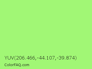 YUV 206.466,-44.107,-39.874 Color is a light green color and the nearest color is Inchworm #b2ec5d. Hex code #a1f775 and RGB value is rgb(161,247,117). In RGB color space, this color is composed of 63% red, 97% green, 46% blue, In CMYK color space, this color is composed of 35% cyan, 0% magenta, 53% yellow , 3% black , In HSL color space, this color has a hue angle of 100° , 89% saturation and 71% lightness.