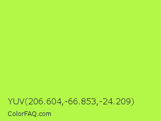 YUV 206.604,-66.853,-24.209 Color is a light green color and the nearest color is Green Lizard #a7f432. Hex code #b3f747 and RGB value is rgb(179,247,71). In RGB color space, this color is composed of 70% red, 97% green, 28% blue, In CMYK color space, this color is composed of 28% cyan, 0% magenta, 71% yellow , 3% black , In HSL color space, this color has a hue angle of 83° , 92% saturation and 62% lightness.