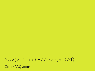 YUV 206.653,-77.723,9.074 Color is a normal yellow color and the nearest color is Pear #d1e231. Hex code #d9e831 and RGB value is rgb(217,232,49). In RGB color space, this color is composed of 85% red, 91% green, 19% blue, In CMYK color space, this color is composed of 6% cyan, 0% magenta, 79% yellow , 9% black , In HSL color space, this color has a hue angle of 65° , 80% saturation and 55% lightness.