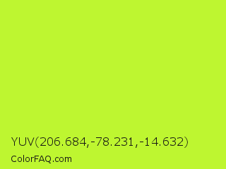 YUV 206.684,-78.231,-14.632 Color is a normal lime color and the nearest color is Green Yellow #adff2f. Hex code #bef630 and RGB value is rgb(190,246,48). In RGB color space, this color is composed of 75% red, 96% green, 19% blue, In CMYK color space, this color is composed of 23% cyan, 0% magenta, 80% yellow , 4% black , In HSL color space, this color has a hue angle of 77° , 92% saturation and 58% lightness.