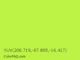 YUV 206.719,-67.895,-16.417 Color is a light lime color and the nearest color is Inchworm #b2ec5d. Hex code #bcf345 and RGB value is rgb(188,243,69). In RGB color space, this color is composed of 74% red, 95% green, 27% blue, In CMYK color space, this color is composed of 23% cyan, 0% magenta, 72% yellow , 5% black , In HSL color space, this color has a hue angle of 79° , 88% saturation and 61% lightness.