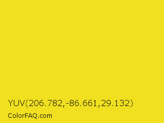 YUV 206.782,-86.661,29.132 Color is a normal yellow color and the nearest color is Ripe Lemon #f4d81c. Hex code #f0e01f and RGB value is rgb(240,224,31). In RGB color space, this color is composed of 94% red, 88% green, 12% blue, In CMYK color space, this color is composed of 0% cyan, 7% magenta, 87% yellow , 6% black , In HSL color space, this color has a hue angle of 55° , 87% saturation and 53% lightness.