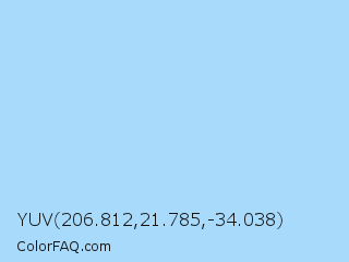 YUV 206.812,21.785,-34.038 Color is a very light blue color and the nearest color is Fresh Air #a6e7ff. Hex code #a8dafb and RGB value is rgb(168,218,251). In RGB color space, this color is composed of 66% red, 85% green, 98% blue, In CMYK color space, this color is composed of 33% cyan, 13% magenta, 0% yellow , 2% black , In HSL color space, this color has a hue angle of 204° , 91% saturation and 82% lightness.