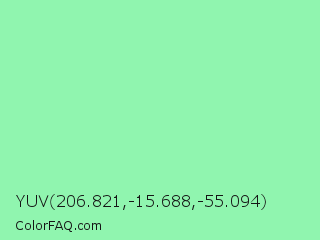 YUV 206.821,-15.688,-55.094 Color is a light green color and the nearest color is Teal Deer #99e6b3. Hex code #90f5af and RGB value is rgb(144,245,175). In RGB color space, this color is composed of 56% red, 96% green, 69% blue, In CMYK color space, this color is composed of 41% cyan, 0% magenta, 29% yellow , 4% black , In HSL color space, this color has a hue angle of 138° , 83% saturation and 76% lightness.