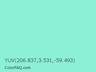 YUV 206.837,3.531,-59.493 Color is a light cyan color and the nearest color is Riptide #8be6d8. Hex code #8bf0d6 and RGB value is rgb(139,240,214). In RGB color space, this color is composed of 55% red, 94% green, 84% blue, In CMYK color space, this color is composed of 42% cyan, 0% magenta, 11% yellow , 6% black , In HSL color space, this color has a hue angle of 165° , 77% saturation and 74% lightness.