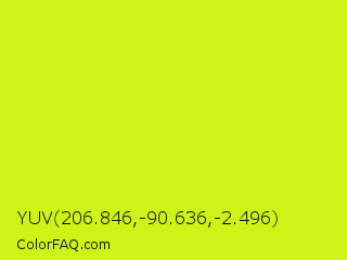 YUV 206.846,-90.636,-2.496 Color is a normal lime color and the nearest color is Arctic Lime #d0ff14. Hex code #ccf417 and RGB value is rgb(204,244,23). In RGB color space, this color is composed of 80% red, 96% green, 9% blue, In CMYK color space, this color is composed of 16% cyan, 0% magenta, 91% yellow , 4% black , In HSL color space, this color has a hue angle of 71° , 91% saturation and 52% lightness.