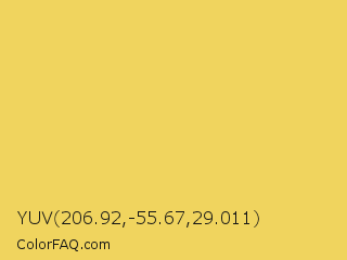 YUV 206.92,-55.67,29.011 Color is a light yellow color and the nearest color is Confetti #e9d75a. Hex code #f0d45e and RGB value is rgb(240,212,94). In RGB color space, this color is composed of 94% red, 83% green, 37% blue, In CMYK color space, this color is composed of 0% cyan, 12% magenta, 61% yellow , 6% black , In HSL color space, this color has a hue angle of 48° , 83% saturation and 65% lightness.