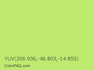 YUV 206.936,-46.803,-14.853 Color is a light green color and the nearest color is Sulu #c1f07c. Hex code #beea70 and RGB value is rgb(190,234,112). In RGB color space, this color is composed of 75% red, 92% green, 44% blue, In CMYK color space, this color is composed of 19% cyan, 0% magenta, 52% yellow , 8% black , In HSL color space, this color has a hue angle of 82° , 74% saturation and 68% lightness.