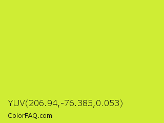 YUV 206.94,-76.385,0.053 Color is a normal yellow color and the nearest color is Pear #d1e231. Hex code #cfed34 and RGB value is rgb(207,237,52). In RGB color space, this color is composed of 81% red, 93% green, 20% blue, In CMYK color space, this color is composed of 13% cyan, 0% magenta, 78% yellow , 7% black , In HSL color space, this color has a hue angle of 70° , 84% saturation and 57% lightness.