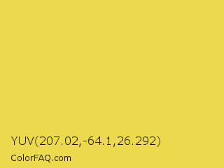 YUV 207.02,-64.1,26.292 Color is a light yellow color and the nearest color is Minion Yellow #f5e050. Hex code #edd94d and RGB value is rgb(237,217,77). In RGB color space, this color is composed of 93% red, 85% green, 30% blue, In CMYK color space, this color is composed of 0% cyan, 8% magenta, 68% yellow , 7% black , In HSL color space, this color has a hue angle of 53° , 82% saturation and 62% lightness.