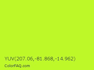 YUV 207.06,-81.868,-14.962 Color is a normal lime color and the nearest color is Green Yellow #adff2f. Hex code #bef829 and RGB value is rgb(190,248,41). In RGB color space, this color is composed of 75% red, 97% green, 16% blue, In CMYK color space, this color is composed of 23% cyan, 0% magenta, 83% yellow , 3% black , In HSL color space, this color has a hue angle of 77° , 94% saturation and 57% lightness.