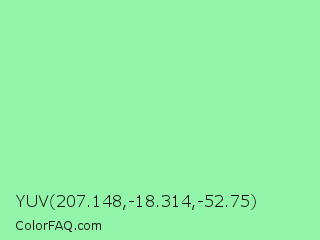 YUV 207.148,-18.314,-52.75 Color is a light green color and the nearest color is Teal Deer #99e6b3. Hex code #93f5aa and RGB value is rgb(147,245,170). In RGB color space, this color is composed of 58% red, 96% green, 67% blue, In CMYK color space, this color is composed of 40% cyan, 0% magenta, 31% yellow , 4% black , In HSL color space, this color has a hue angle of 134° , 83% saturation and 77% lightness.