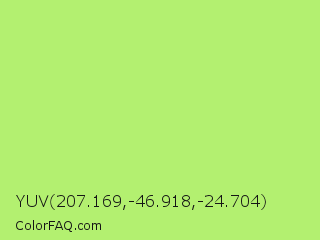 YUV 207.169,-46.918,-24.704 Color is a light green color and the nearest color is Sulu #c1f07c. Hex code #b3f070 and RGB value is rgb(179,240,112). In RGB color space, this color is composed of 70% red, 94% green, 44% blue, In CMYK color space, this color is composed of 25% cyan, 0% magenta, 53% yellow , 6% black , In HSL color space, this color has a hue angle of 89° , 81% saturation and 69% lightness.