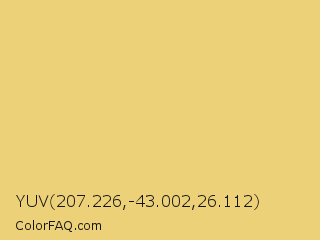 YUV 207.226,-43.002,26.112 Color is a light yellow color and the nearest color is Golden Sand #f0db7d. Hex code #edd178 and RGB value is rgb(237,209,120). In RGB color space, this color is composed of 93% red, 82% green, 47% blue, In CMYK color space, this color is composed of 0% cyan, 12% magenta, 49% yellow , 7% black , In HSL color space, this color has a hue angle of 46° , 76% saturation and 70% lightness.