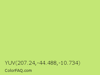 YUV 207.24,-44.488,-10.734 Color is a light lime color and the nearest color is Yellow Green #c5e17a. Hex code #c3e775 and RGB value is rgb(195,231,117). In RGB color space, this color is composed of 76% red, 91% green, 46% blue, In CMYK color space, this color is composed of 16% cyan, 0% magenta, 49% yellow , 9% black , In HSL color space, this color has a hue angle of 79° , 70% saturation and 68% lightness.