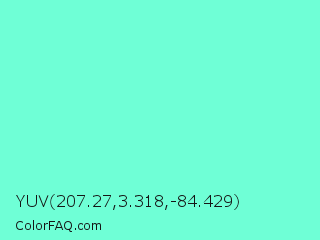 YUV 207.27,3.318,-84.429 Color is a light green color and the nearest color is Aquamarine #7fffd4. Hex code #6fffd6 and RGB value is rgb(111,255,214). In RGB color space, this color is composed of 44% red, 100% green, 84% blue, In CMYK color space, this color is composed of 56% cyan, 0% magenta, 16% yellow , 0% black , In HSL color space, this color has a hue angle of 163° , 100% saturation and 72% lightness.
