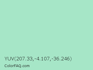 YUV 207.33,-4.107,-36.246 Color is a light green color and the nearest color is Padua #ade6c4. Hex code #a6e6c7 and RGB value is rgb(166,230,199). In RGB color space, this color is composed of 65% red, 90% green, 78% blue, In CMYK color space, this color is composed of 28% cyan, 0% magenta, 13% yellow , 10% black , In HSL color space, this color has a hue angle of 151° , 56% saturation and 78% lightness.