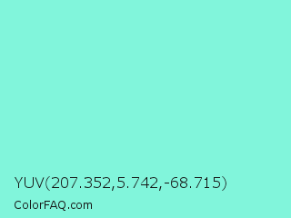 YUV 207.352,5.742,-68.715 Color is a light cyan color and the nearest color is Aquamarine #7fffd4. Hex code #81f5db and RGB value is rgb(129,245,219). In RGB color space, this color is composed of 51% red, 96% green, 86% blue, In CMYK color space, this color is composed of 47% cyan, 0% magenta, 11% yellow , 4% black , In HSL color space, this color has a hue angle of 167° , 85% saturation and 73% lightness.