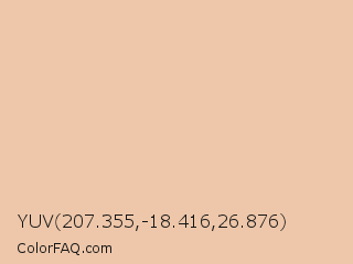 YUV 207.355,-18.416,26.876 Color is a light orange color and the nearest color is Desert Sand #edc9af. Hex code #eec7aa and RGB value is rgb(238,199,170). In RGB color space, this color is composed of 93% red, 78% green, 67% blue, In CMYK color space, this color is composed of 0% cyan, 16% magenta, 29% yellow , 7% black , In HSL color space, this color has a hue angle of 26° , 67% saturation and 80% lightness.