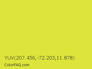 YUV 207.456,-72.203,11.878 Color is a normal yellow color and the nearest color is Pear #d1e231. Hex code #dde53d and RGB value is rgb(221,229,61). In RGB color space, this color is composed of 87% red, 90% green, 24% blue, In CMYK color space, this color is composed of 3% cyan, 0% magenta, 73% yellow , 10% black , In HSL color space, this color has a hue angle of 63° , 76% saturation and 57% lightness.