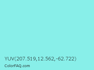 YUV 207.519,12.562,-62.722 Color is a light cyan color and the nearest color is Riptide #8be6d8. Hex code #88efe9 and RGB value is rgb(136,239,233). In RGB color space, this color is composed of 53% red, 94% green, 91% blue, In CMYK color space, this color is composed of 43% cyan, 0% magenta, 3% yellow , 6% black , In HSL color space, this color has a hue angle of 177° , 76% saturation and 74% lightness.