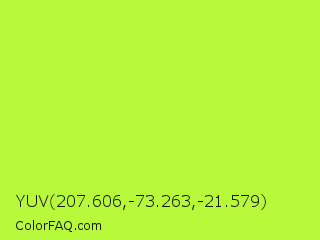 YUV 207.606,-73.263,-21.579 Color is a normal green color and the nearest color is Green Yellow #adff2f. Hex code #b7f93b and RGB value is rgb(183,249,59). In RGB color space, this color is composed of 72% red, 98% green, 23% blue, In CMYK color space, this color is composed of 27% cyan, 0% magenta, 76% yellow , 2% black , In HSL color space, this color has a hue angle of 81° , 94% saturation and 60% lightness.