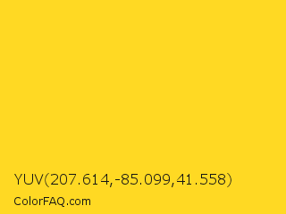 YUV 207.614,-85.099,41.558 Color is a normal yellow color and the nearest color is Candlelight #fcd917. Hex code #ffd923 and RGB value is rgb(255,217,35). In RGB color space, this color is composed of 100% red, 85% green, 14% blue, In CMYK color space, this color is composed of 0% cyan, 15% magenta, 86% yellow , 0% black , In HSL color space, this color has a hue angle of 50° , 100% saturation and 57% lightness.