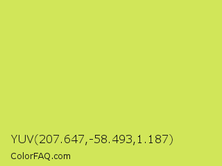 YUV 207.647,-58.493,1.187 Color is a light yellow color and the nearest color is Maximum Green Yellow #d9e650. Hex code #d1e659 and RGB value is rgb(209,230,89). In RGB color space, this color is composed of 82% red, 90% green, 35% blue, In CMYK color space, this color is composed of 9% cyan, 0% magenta, 61% yellow , 10% black , In HSL color space, this color has a hue angle of 69° , 74% saturation and 63% lightness.