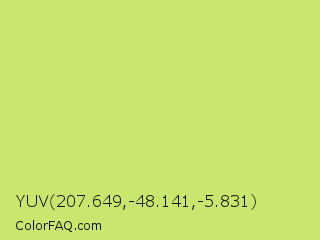 YUV 207.649,-48.141,-5.831 Color is a light lime color and the nearest color is Yellow Green #c5e17a. Hex code #c9e66e and RGB value is rgb(201,230,110). In RGB color space, this color is composed of 79% red, 90% green, 43% blue, In CMYK color space, this color is composed of 13% cyan, 0% magenta, 52% yellow , 10% black , In HSL color space, this color has a hue angle of 75° , 71% saturation and 67% lightness.