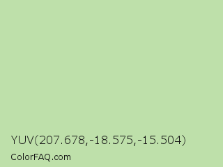 YUV 207.678,-18.575,-15.504 Color is a light green color and the nearest color is Sprout #c1d7b0. Hex code #bee0aa and RGB value is rgb(190,224,170). In RGB color space, this color is composed of 75% red, 88% green, 67% blue, In CMYK color space, this color is composed of 15% cyan, 0% magenta, 24% yellow , 12% black , In HSL color space, this color has a hue angle of 98° , 47% saturation and 77% lightness.