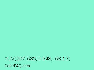 YUV 207.685,0.648,-68.13 Color is a light green color and the nearest color is Aquamarine #7fffd4. Hex code #82f7d1 and RGB value is rgb(130,247,209). In RGB color space, this color is composed of 51% red, 97% green, 82% blue, In CMYK color space, this color is composed of 47% cyan, 0% magenta, 15% yellow , 3% black , In HSL color space, this color has a hue angle of 161° , 88% saturation and 74% lightness.