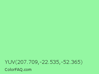 YUV 207.709,-22.535,-52.365 Color is a light green color and the nearest color is Pale Green #98fb98. Hex code #94f7a2 and RGB value is rgb(148,247,162). In RGB color space, this color is composed of 58% red, 97% green, 64% blue, In CMYK color space, this color is composed of 40% cyan, 0% magenta, 34% yellow , 3% black , In HSL color space, this color has a hue angle of 128° , 86% saturation and 77% lightness.